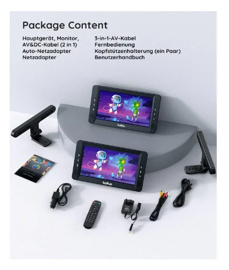 BOIFUN BFN-101 is a dual-screen 10.5 inch portable car DVD player set with 1024 x 600 HD headrest monitors designed to keep families entertained on long drives. The main unit includes a built-in DVD player with 7 hour rechargeable battery, while the second screen mirrors playback via AV connection for a synchronized viewing experience in the back seats.