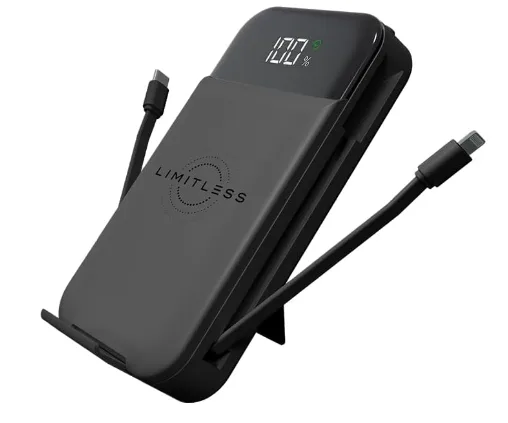 For the latest wireless phones, the Ultimate Pro power bank includes a Qi-enabled wireless charging pad. Moreover, it delivers up to 15W wireless fast charging for compatible smartphones and earbuds. Simply place your device on the pad to enjoy cable-free charging at home, in the office, or in a café. The built‑in retractable AC wall plug lets you recharge the power bank directly from any wall socket, so no separate adapter is required.