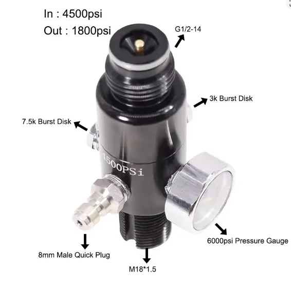 • Precise Pressure Regulation: Built-in 4500psi to 1800psi valve reducer ensures controlled flow for airguns up to 300 bar capacity.